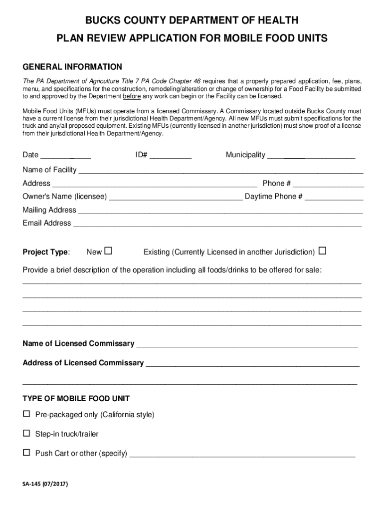 BUCKS COUNTY DEPARTMENT OF HEALTH PLAN REVIEW APPLICATION FOR MOBILE FOOD UNITS GENERAL INFORMATION The PA Department of Agriculture Title 7 PA Code Chapter 46 requires that a properly prepared application,