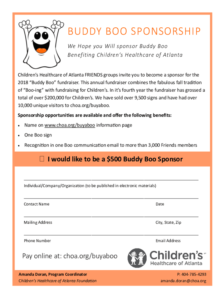 BUDDY BOO SPONSORSHIP We Hope you Will sponsor Buddy Boo Benefiting Children's Healthcare of Atlanta Children's Healthcare of Atlanta FRIENDS groups invite you to become a sponsor for the 2018 Buddy