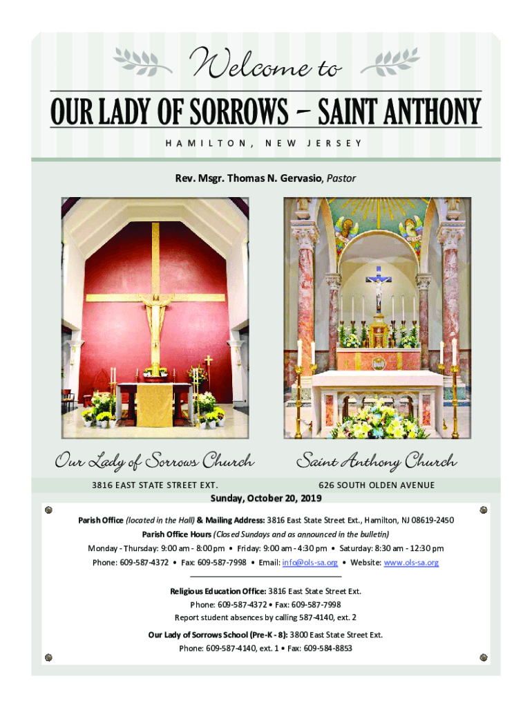 OUR LADY OF SORROWS SAINT ANTHONY H A M I L T O N, N E WE E R S EY Rev. Msgr. Thomas N. Gervais, Pastor3816 EAST STATE STREET EXT.626 SOUTH OLDEN AVENUE Sunday, October 20, 2019, Parish Office (located