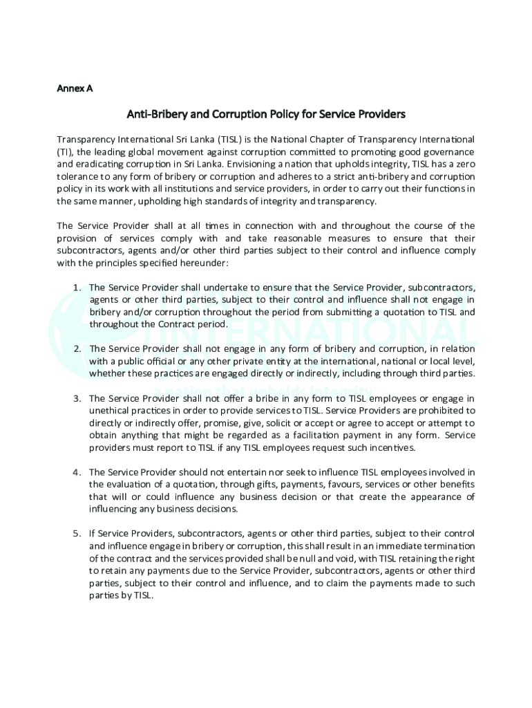 Annex AAntiBribery and Corruption Policy for Service Providers Transparency International Sri Lanka (TILL) is the National Chapter of Transparency International (TI), the leading global movement against