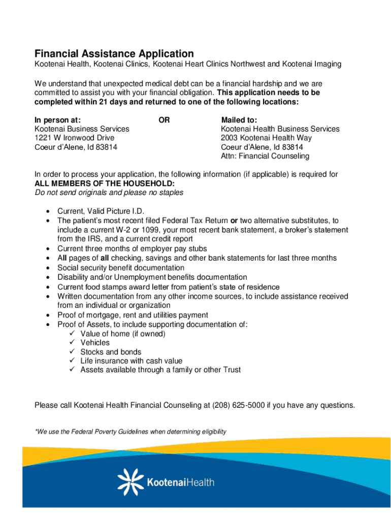 Financial Assistance Application Kootenai Health, Kootenai Clinics, Kootenai Heart Clinics Northwest and Kootenai Imaging We understand that unexpected medical debt can be a financial hardship, and