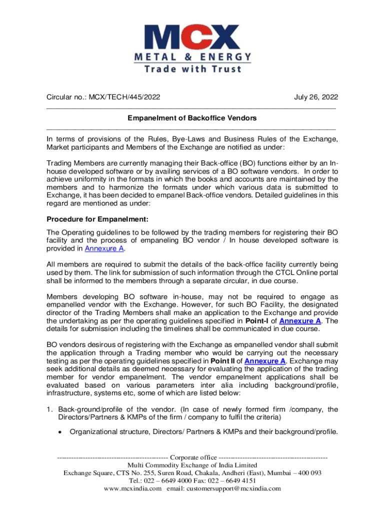 Circular no.: MCX/TECH/445/2022 July 26, 2022 ___ Embankment of Back office Vendors ___ In terms of provisions of the Rules, Bylaws and Business Rules of the Exchange, Market participants and Members