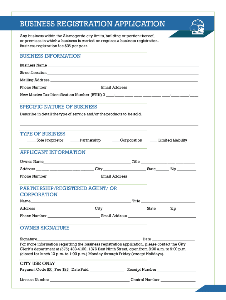 BUSINESS REGISTRATION APPLICATION Any business within the Alamogordo city limits, building or portion thereof, or premises in which a business is carried on requires a business registration. Business