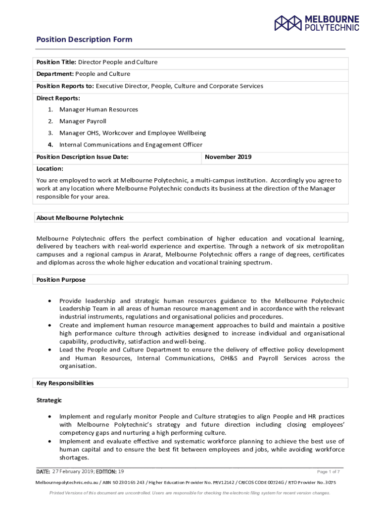 Position Description Form Position Title: Director People and Culture Department: People and Culture Position Reports to: Executive Director, People, Culture and Corporate Services Direct Reports: