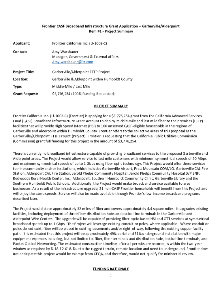 Applicant:Frontier California Inc. (U1002C)Contact:Amy Harsher