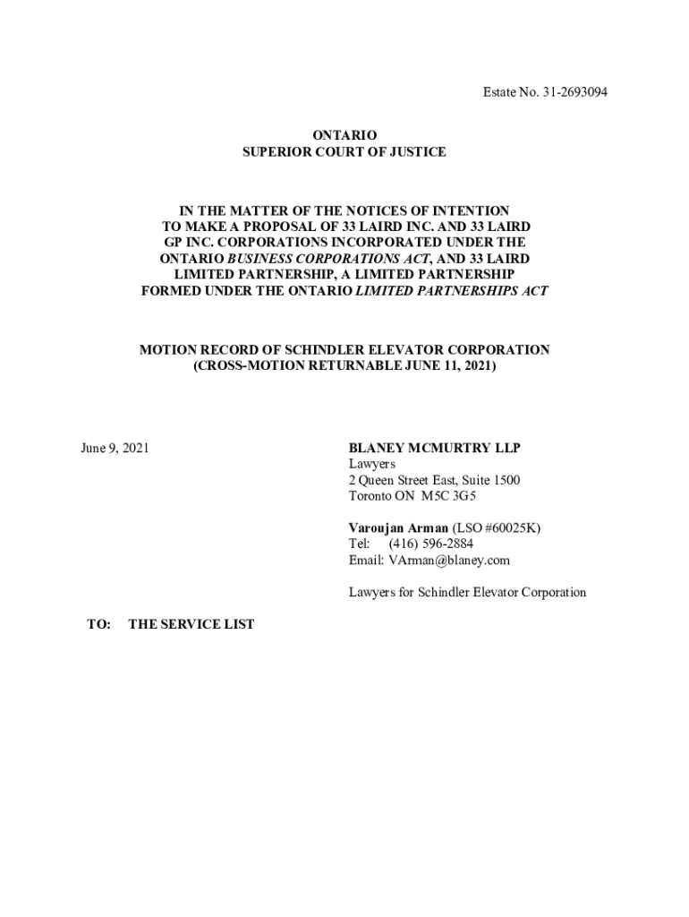 Estate No. 312693094 ONTARIO SUPERIOR COURT OF JUSTICE IN THE MATTER OF THE NOTICES OF INTENTION TO MAKE A PROPOSAL OF 33 LAIRD INC. AND 33 LAIRD GP INC. CORPORATIONS INCORPORATED UNDER THE ONTARIO