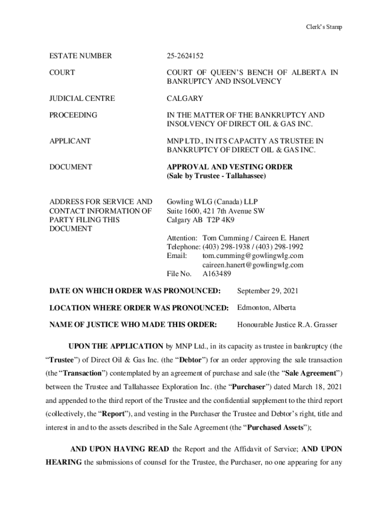 Clerks StampESTATE NUMBER252624152COURTCOURT OF QUEEN'S BENCH OF ALBERTA IN