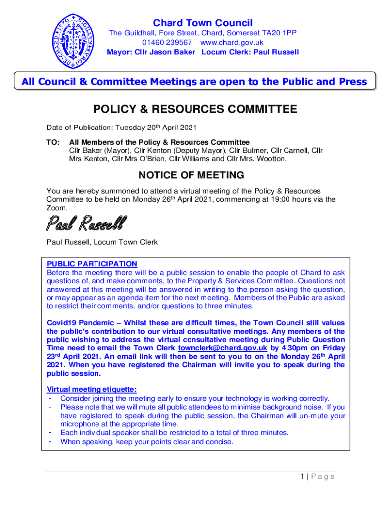 Chard Town Council The Guildhall, Fore Street, Chard, Somerset TA20 1PP 01460 239567 www.chard.gov.uk Mayor: CLR Jason Baker Locum Clerk: Paul Russell Council & Committee Meetings are open to the