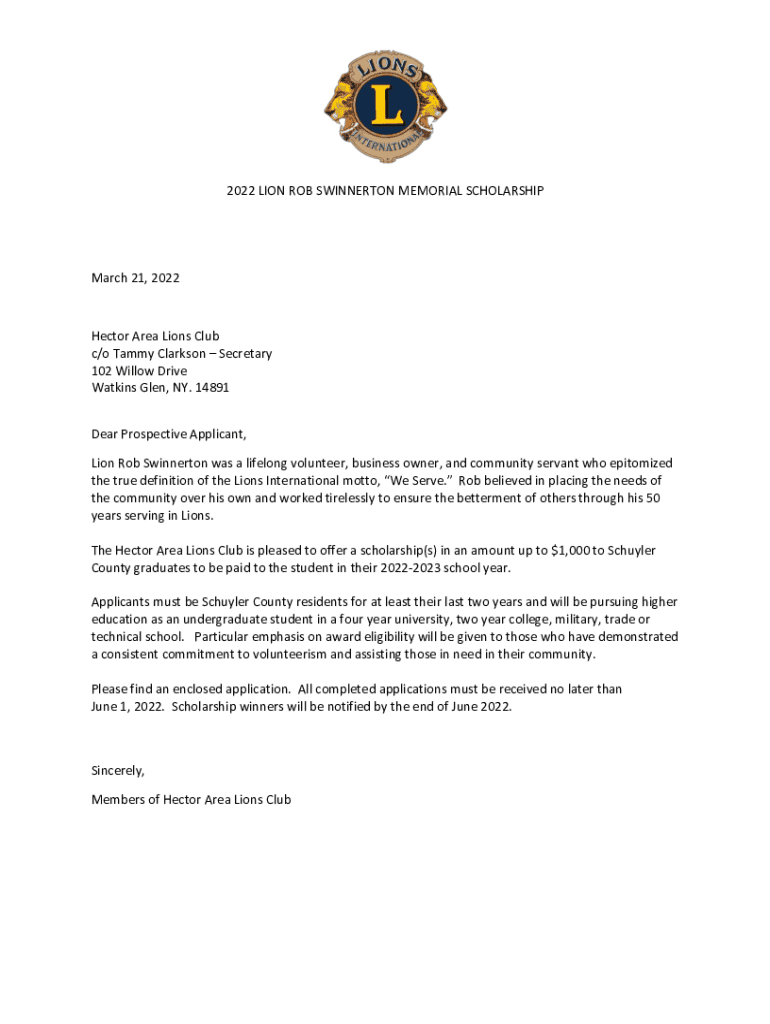 2022 LION ROB PINKERTON MEMORIAL SCHOLARSHIP March 21, 2022Hector Area Lions Club c/o Tammy Clarkson Secretary 102 Willow Drive Watkins Glen, NY. 14891 Dear Prospective Applicant, Lion Rob Pinkerton
