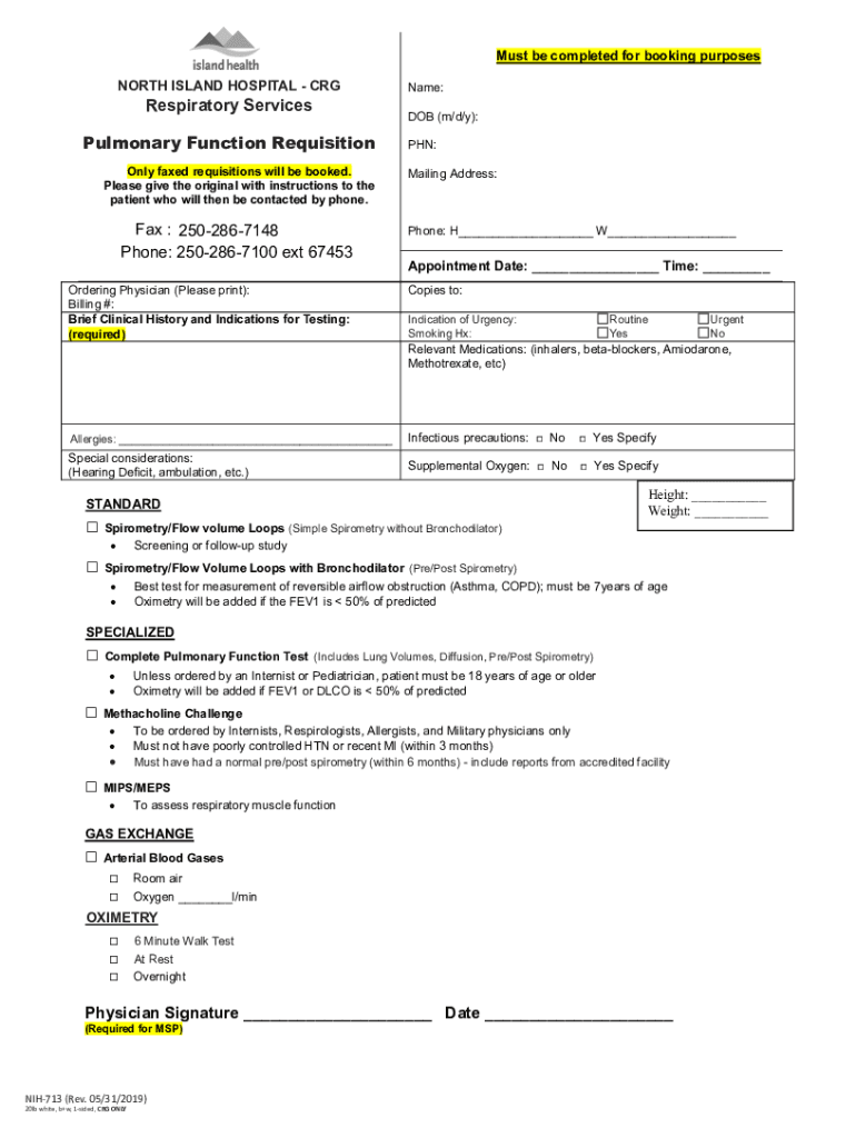 Respiratory Services NORTH ISLAND HOSPITAL CRGPulmonaryServices Function Respiratory Pulmonary Function Requisition Pulmonary Function Requisition Pulmonary Function Requisition Only faxed requisitions