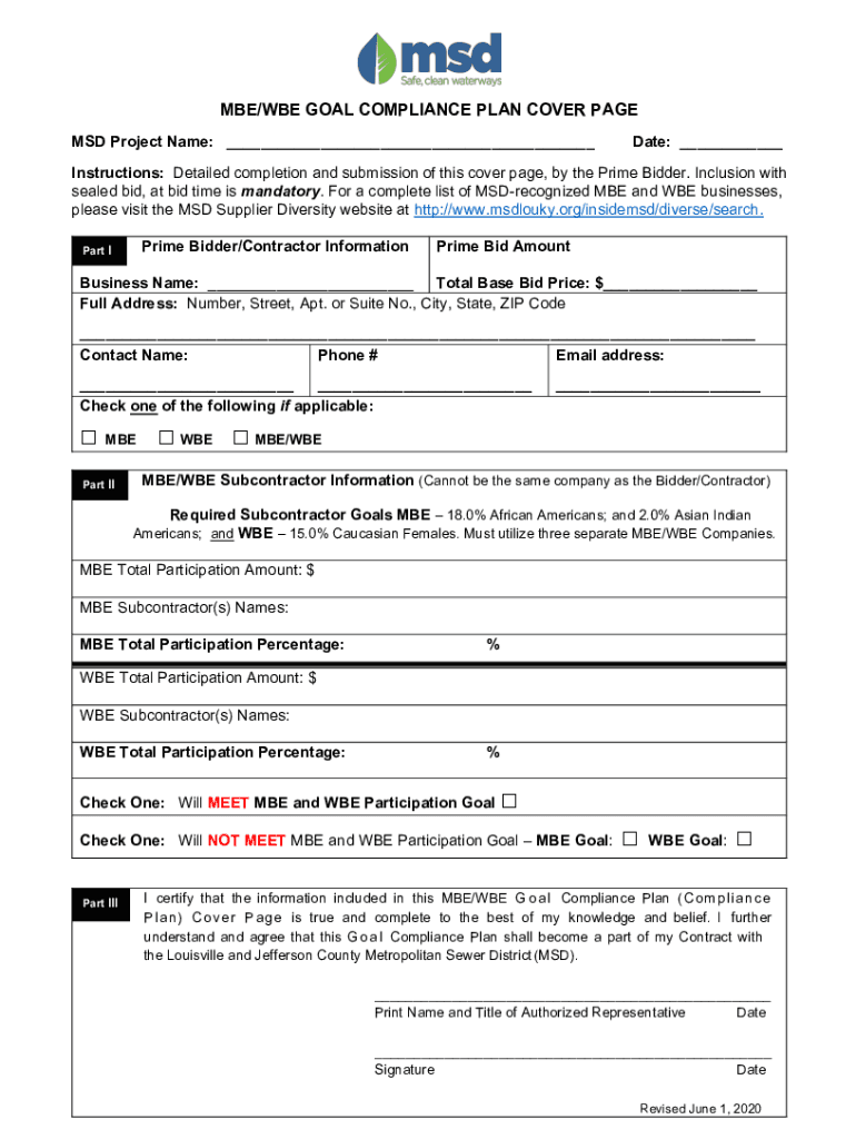 BE/WE GOAL COMPLIANCE PLAN COVER PAGE MSD Project Name: ___Date: ___Instructions: Detailed completion and submission of this cover page, by the Prime Bidder. Inclusion with sealed bid, at bid time