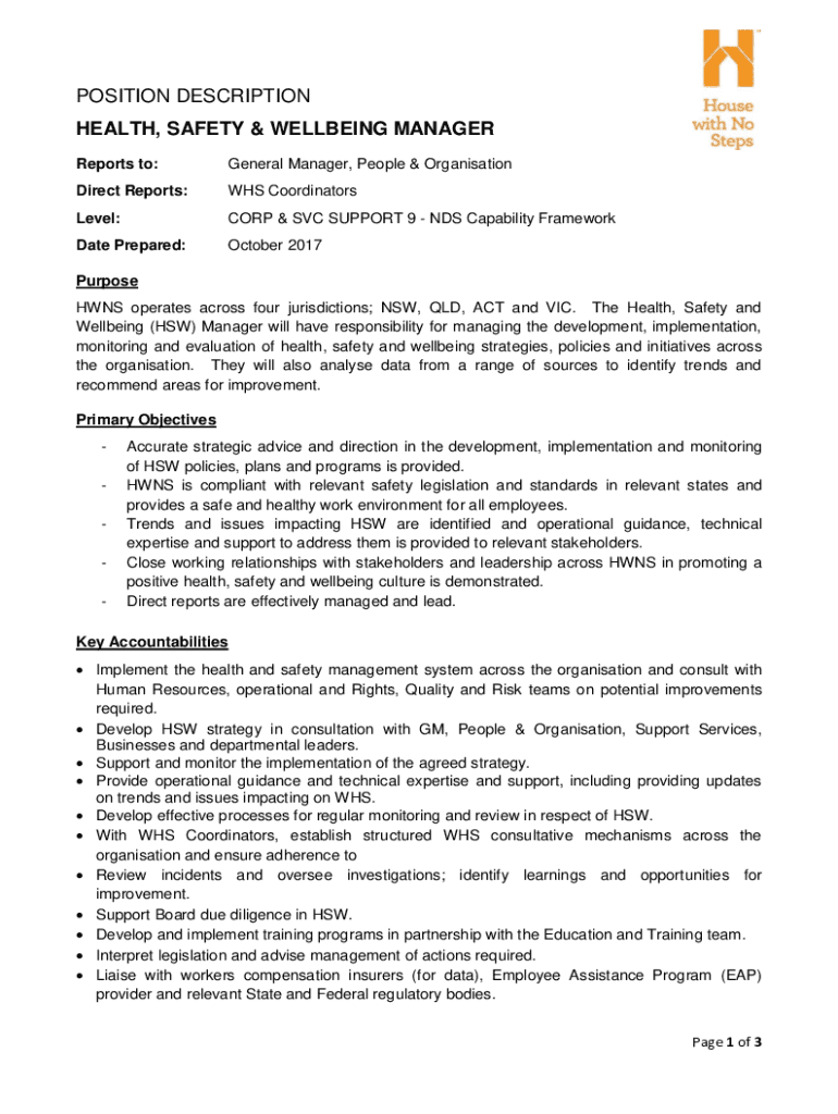 Reports to:General Manager, People & OrganisationDirect Reports:WHS CoordinatorsLevel:CORP & SVC SUPPORT 9 NDS Capability FrameworkDate Prepared:October