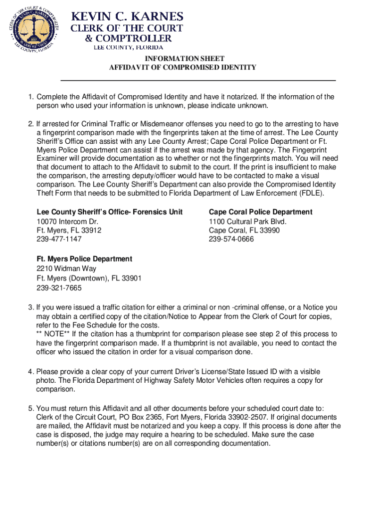 Lee(perform LINDA DOGGED : CLERK OF COURTINFORMATION SHEET AFFIDAVIT OF COMPROMISED IDENTITY1. Complete the Affidavit of Compromised Identity and have it notarized. If the information of the person