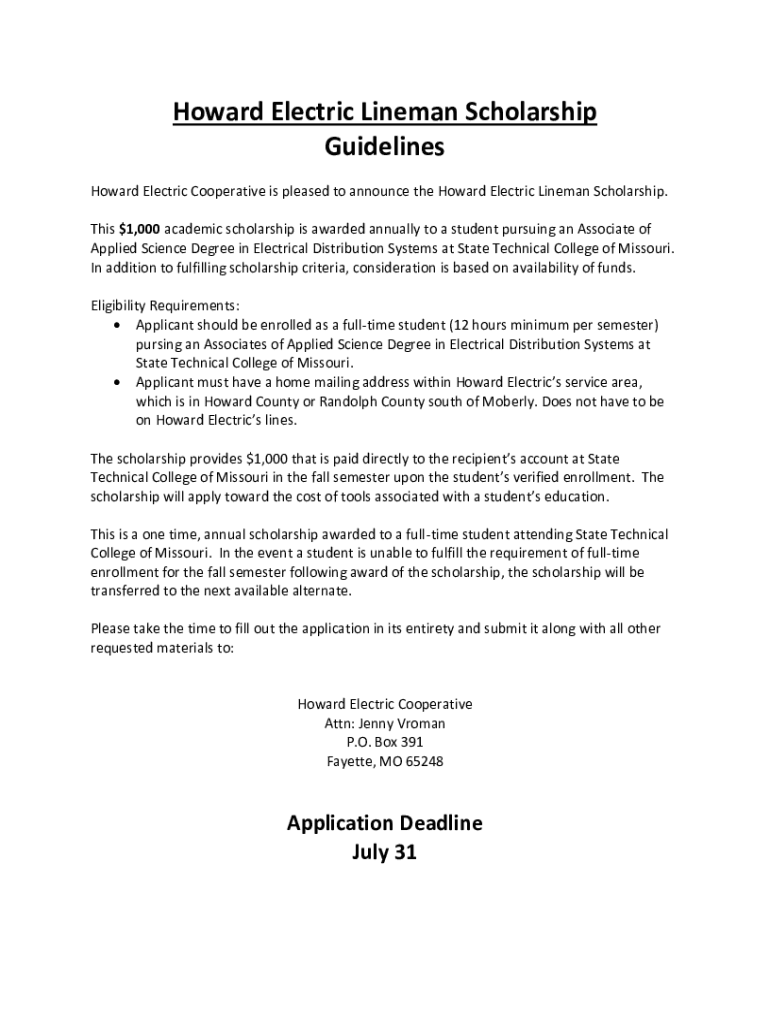 Howard Electric Lineman Scholarship Guidelines Howard Electric Cooperative is pleased to announce the Howard Electric Lineman Scholarship. This $1,000 academic scholarship is awarded annually to a