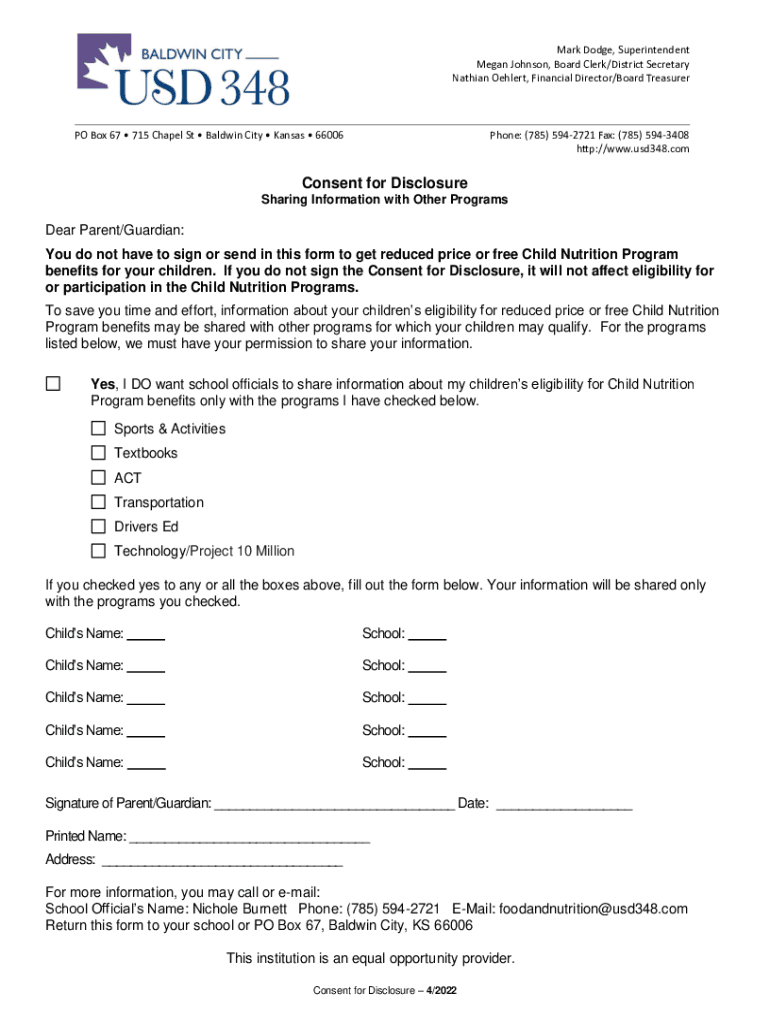 Mark Dodge, Superintendent Megan Johnson, Board Clerk/District Secretary Nathan Other, Financial Director/Board Treasurer PO Box 67 715 Chapel St Baldwin City Kansas 66006Phone: (785) 5942721 Fax: