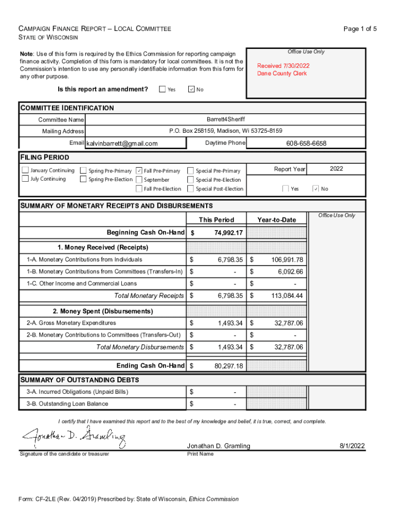 CAMPAIGN FINANCE REPORT LOCAL COMMITTEE Page 1 of 5STATE OF W ISCONSINOffice Use OneNote: Use of this form is required by the Ethics Commission for reporting campaign finance activity. Completion