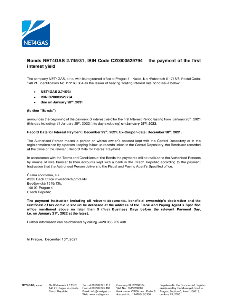 Bonds NET4GAS 2.745/31, ISIN Code CZ0003529794 the payment of the first interest yield The company NET4GAS, s.r.o. with its registered office at Prague 4 Use, Na Bench II 1718/8, Postal Code: 140
