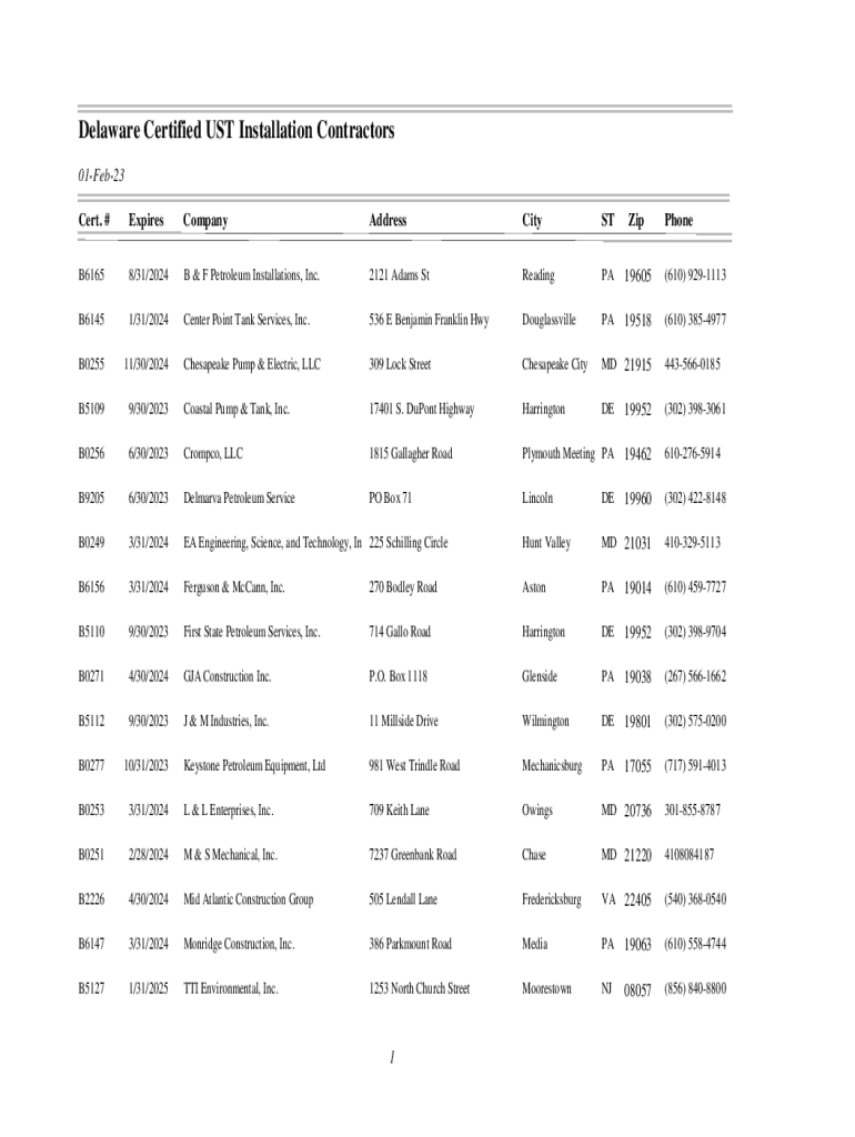 Delaware Certified MUST Installation Contractors 01Feb23 Cert. #ExpiresCompanyAddressCitySTZipB61658/31/2024B & F Petroleum Installations, Inc.2121 Adams StReadingPA19605(610) 9291113B61451/31/2024Center