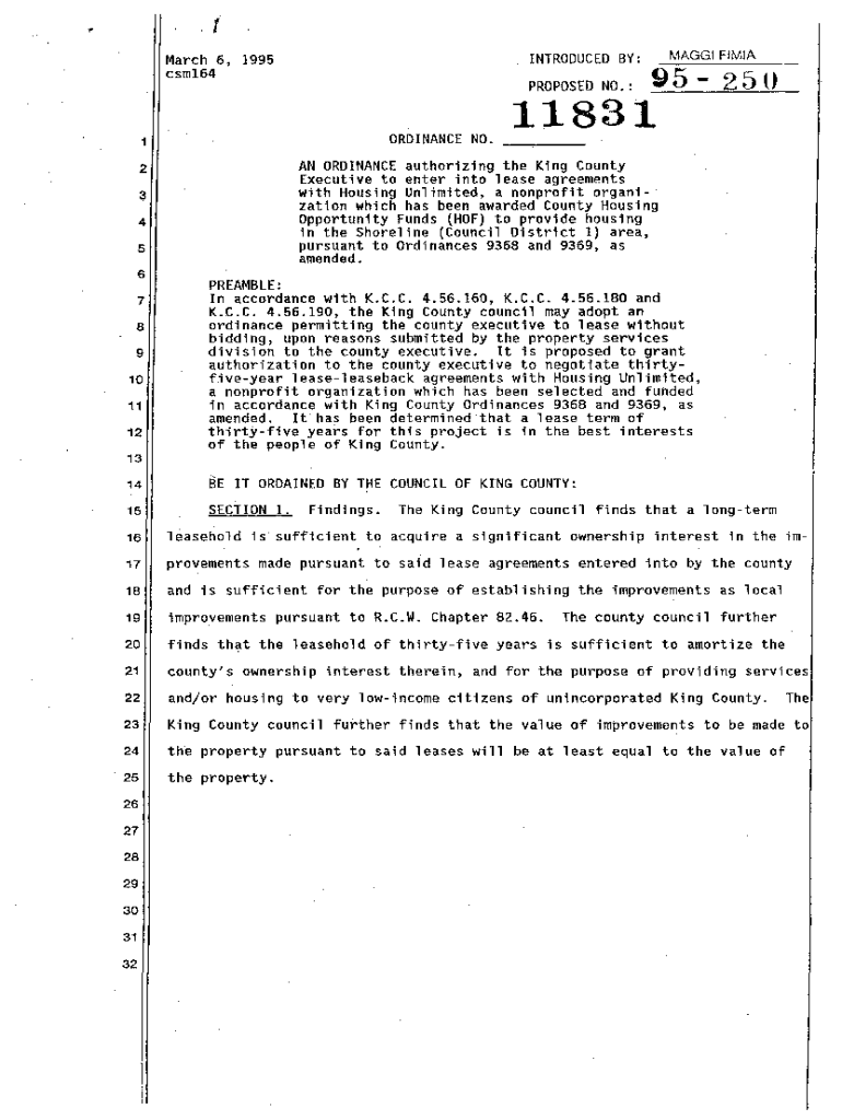 T\'\” March 6, 1995 csm164INTRODUCED BY:MAGGI FIMIAPROPOSED NO.:95 25 011831ORDINANCE NO. _, __1AN ORDINANCE authorizing the King County Executive to enter into lease agreements with Housing Unlimited,
