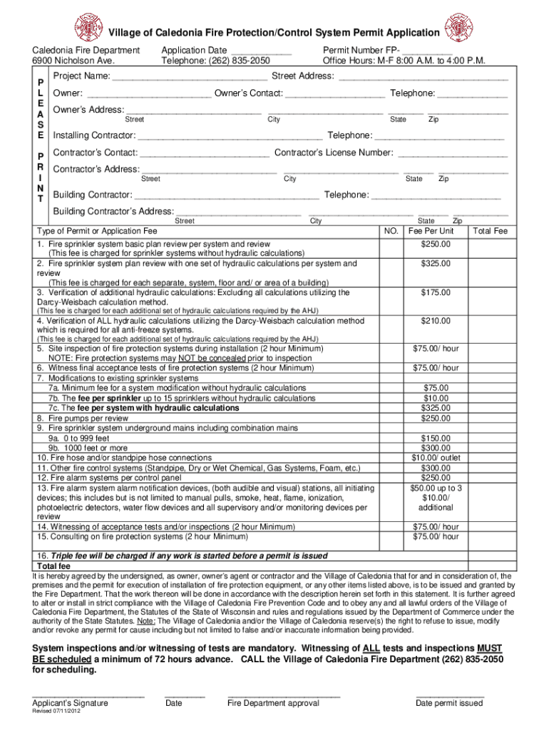 Village of Caledonia Fire Protection/Control System Permit Application Caledonia Fire Department 6900 Nicholson Ave. P L E A S E P R I NT Application Date ___ Telephone: (262) 8352050Permit Number