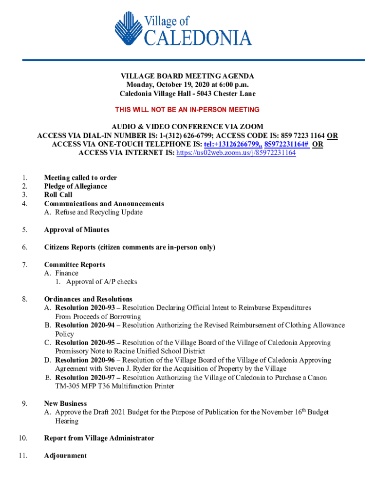 VILLAGE BOARD MEETING AGENDA Monday, October 19, 2020, at 6:00 p.m. Caledonia Village Hall 5043 Chester Lane THIS WILL NOT BE AN UNPERSON MEETINGAUDIO & VIDEO CONFERENCE VIA ZOOM ACCESS VIA DIALING