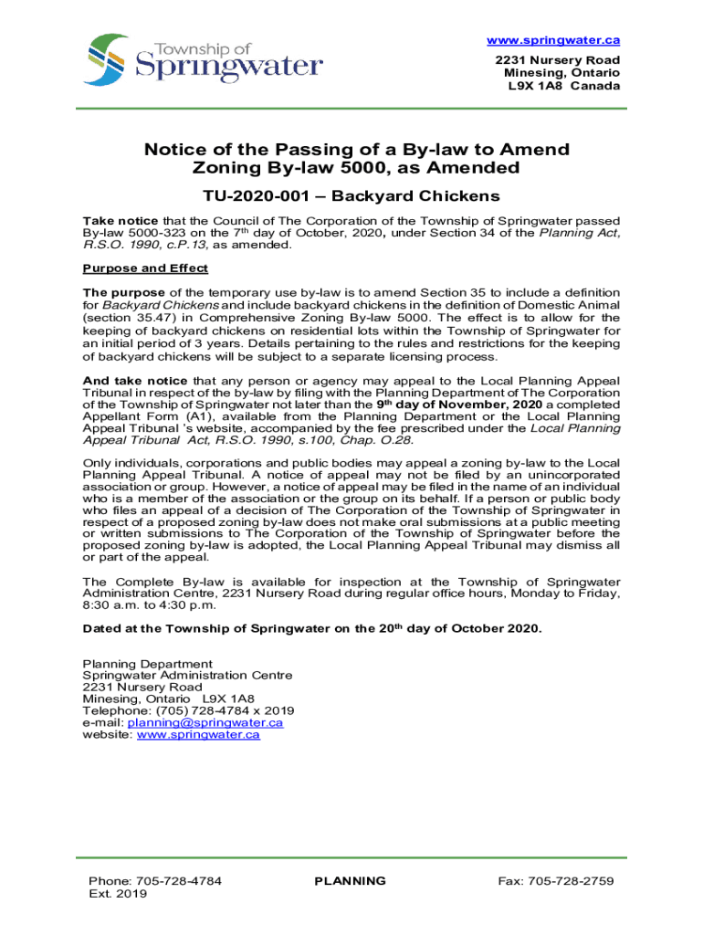 WWW.spring water.ca 2231 Nursery Road Mine sing, Ontario L9X 1A8 CanadaNotice of the Passing of a Bylaw to Amend Zoning Bylaw 5000, as Amended TU2020001 Backyard Chickens Take notice that the Council