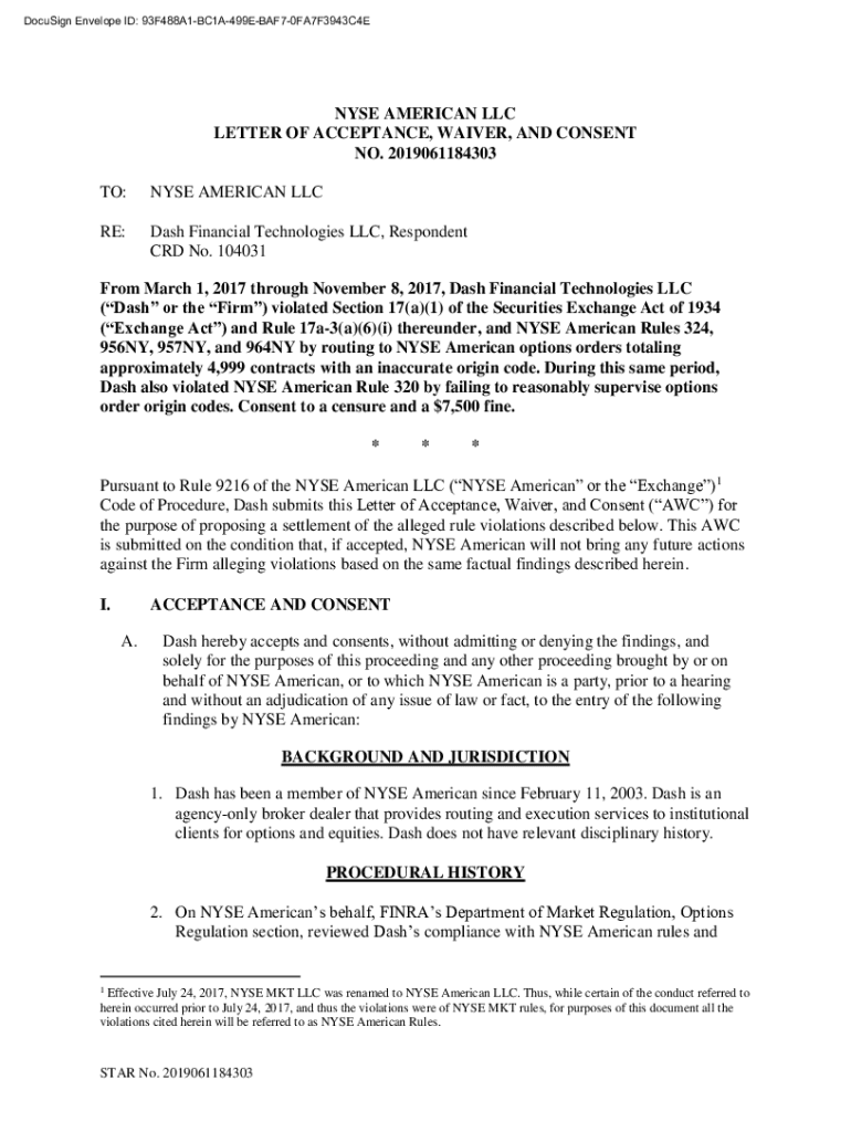 Get the free NYSE AMERICAN LLC RE: Dash Financial Technolog