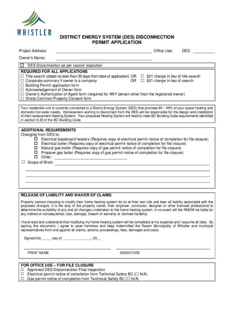 DISTRICT ENERGY SYSTEM (DES) DISCONNECTION PERMIT APPLICATION Project Address:Office Use:DES:Owners Name: DES Disconnection as per council resolution REQUIRED FOR ALL APPLICATIONS Title search (dated