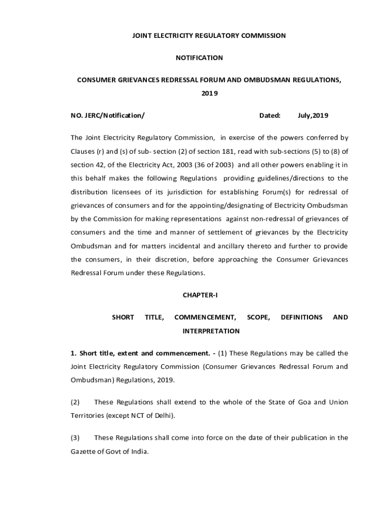 JOINT ELECTRICITY REGULATORY COMMISSION NOTIFICATION CONSUMER GRIEVANCES Reparation FORUM AND OMBUDSMAN REGULATIONS, 2019 NO. JERK/Notification/Dated:July,2019The Joint Electricity Regulatory Commission,