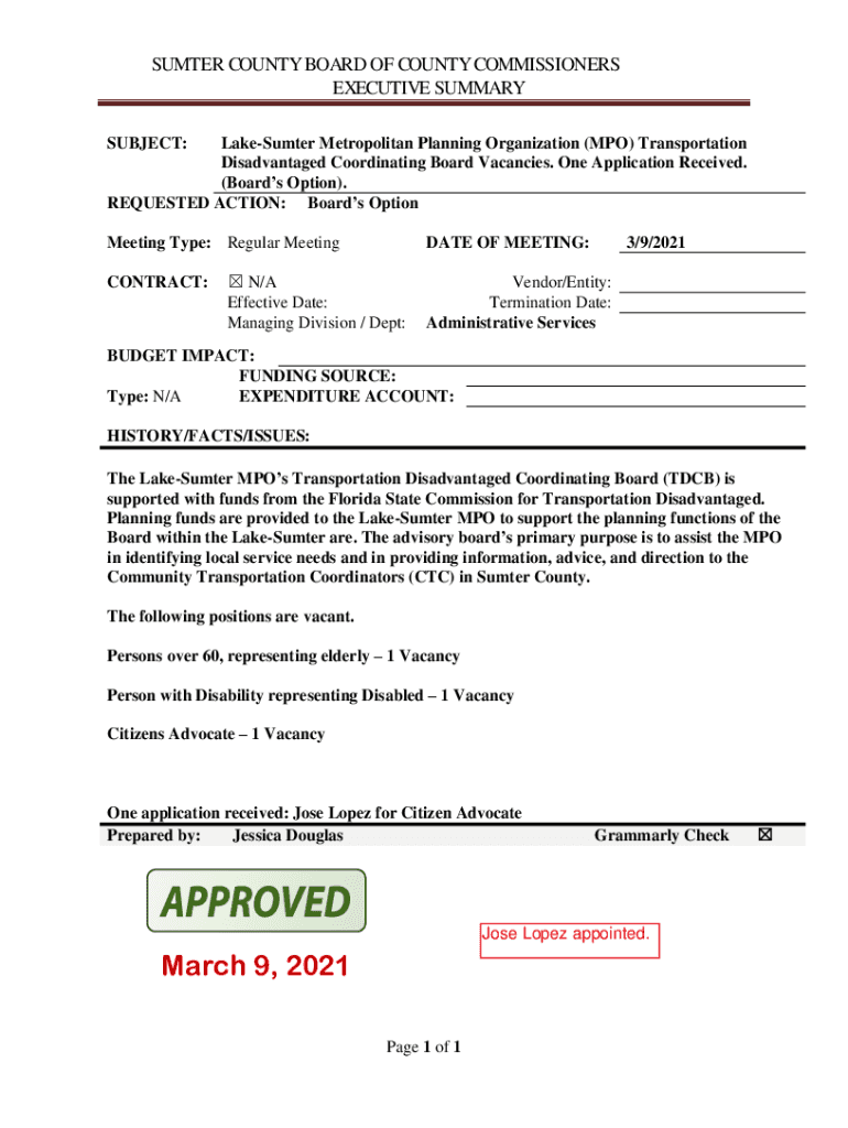 SUMTER COUNTY BOARD OF COUNTY COMMISSIONERS EXECUTIVE SUMMARY SUBJECT:Lake Sumter Metropolitan Planning Organization (MPH) Transportation Disadvantaged Coordinating Board Vacancies. One Application