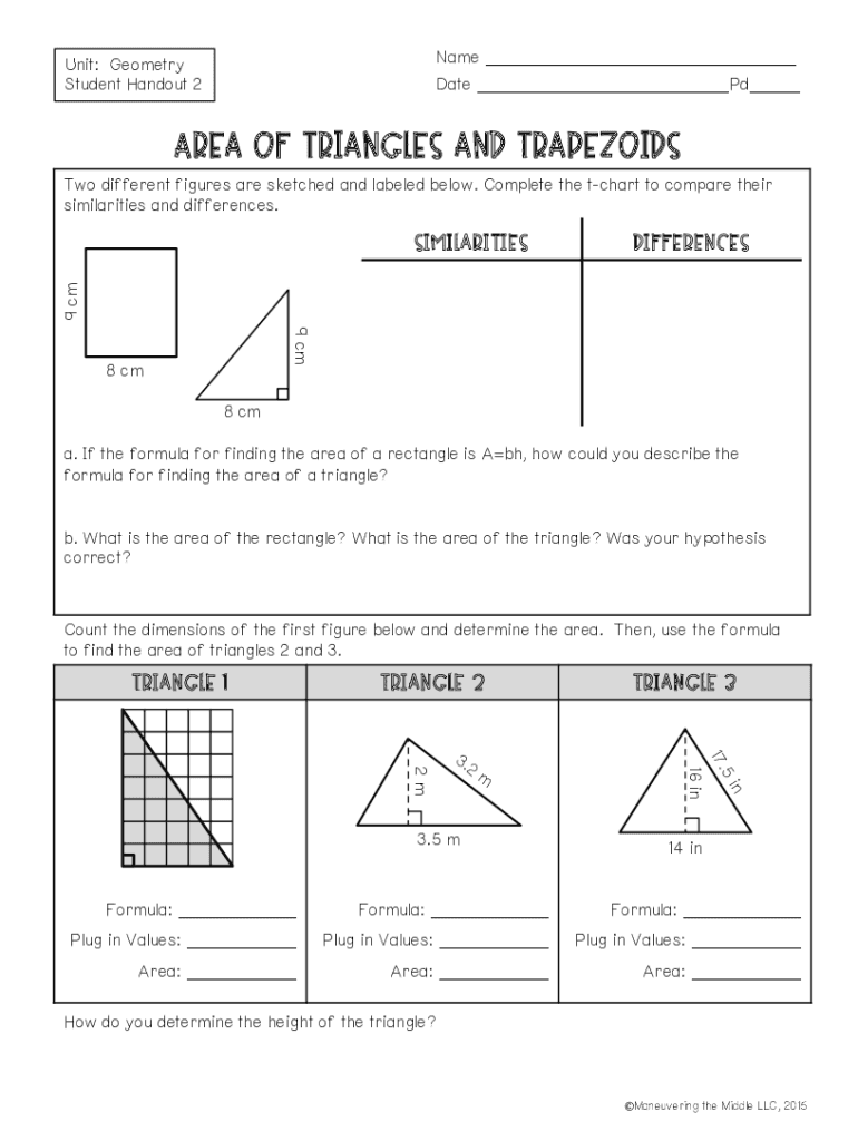 Name ___Unit: Geometry Student Handout 2Date ___Pd___Area of Triangles and trapezoids Two different figures are sketched and labeled below. Complete the chart to compare their similarities and differences.differences9
