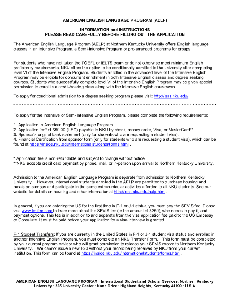 AMERICAN ENGLISH LANGUAGE PROGRAM (HELP) INFORMATION and INSTRUCTIONS PLEASE READ CAREFULLY BEFORE FILLING OUT THE APPLICATION The American English Language Program (HELP) at Northern Kentucky University
