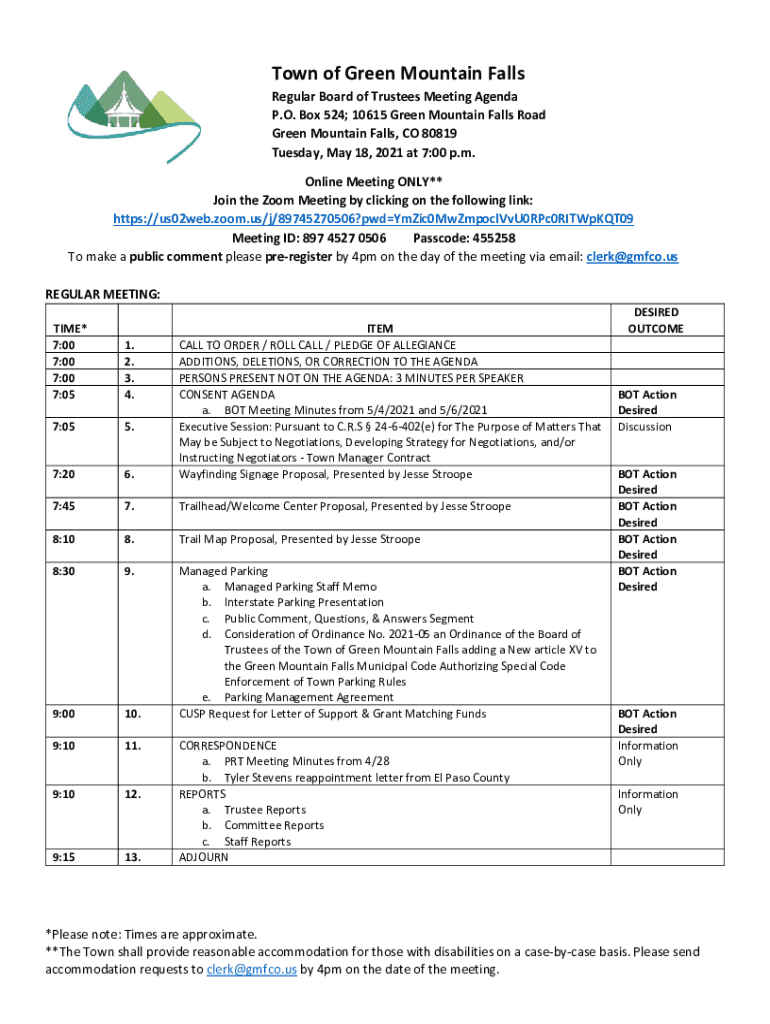 Town of Green Mountain FallsRegular Board of Trustees Meeting Agenda P.O. Box 524; 10615 Green Mountain Falls Road Green Mountain Falls, CO 80819 Tuesday, May 18, 2021, at 7:00 p.m. Online Meeting