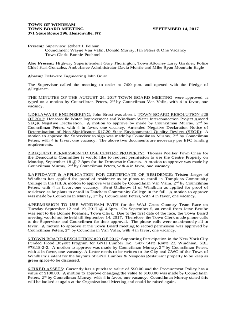 Before starting to fill out Also Present: Highway Superintendent Gary Thorington, Town Attorney Larry Gardner, Police Chief Karl Gonzalez, Ambulance Administrator Davia Montie and Mike Ryan Mountain Eagle .doc form, be sure that you have prepared enough of information required. It's a important part, since some errors can trigger unwanted consequences starting with re-submission of the whole entire and finishing with deadlines missed and even penalties. You have to be pretty observative when writing down figures. At first sight, it might seem to be quite simple. But nevertheless, it is easy to make a mistake. Some people use some sort of a lifehack saving their records in a separate document or a record book and then attach it's content into documents' sample. In either case, try to make all efforts and present accurate and genuine information in Also Present: Highway Superintendent Gary Thorington, Town Attorney Larry Gardner, Police Chief Karl Gonzalez, Ambulance Administrator Davia Montie and Mike Ryan Mountain Eagle form, and check it twice during the process of filling out all the fields. If you find any mistakes later, you can easily make corrections while using PDFfiller editor and avoid missed deadlines.