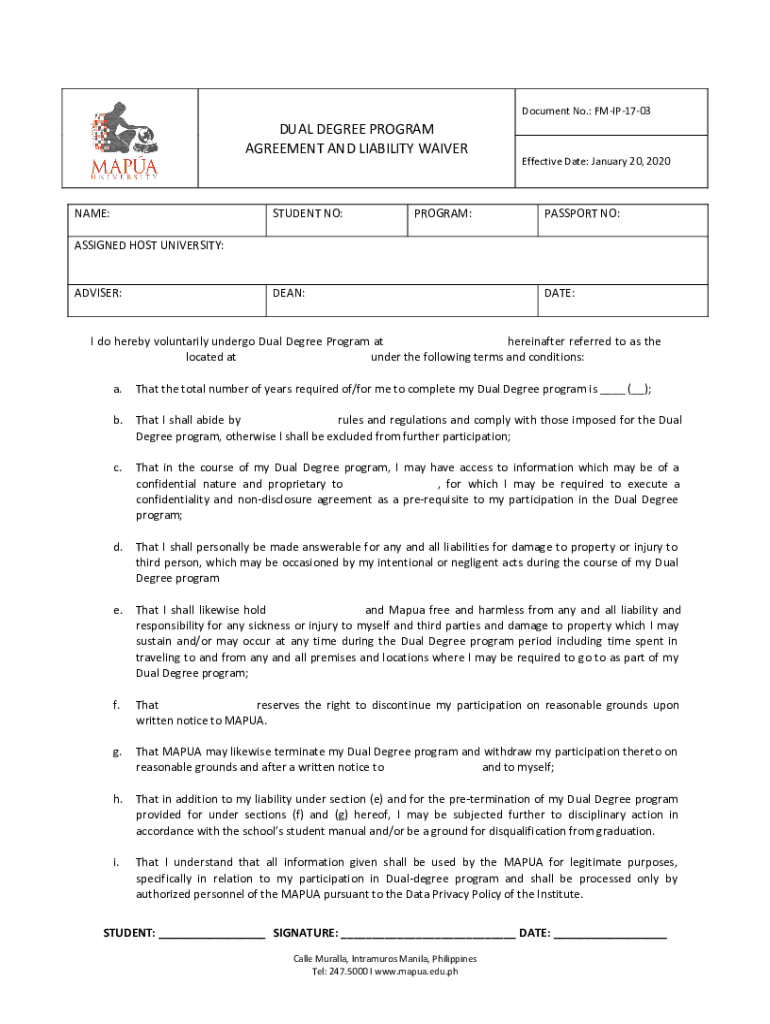 Document No.: FMIP1703DUAL DEGREE PROGRAM AGREEMENT AND LIABILITY ADVERGAME:STUDENT NO:PROGRAM:Effective Date: January 20, 2020PASSPORT NO:ASSIGNED HOST UNIVERSITY:ADVISER:DEAN:DATE:I do hereby voluntarily