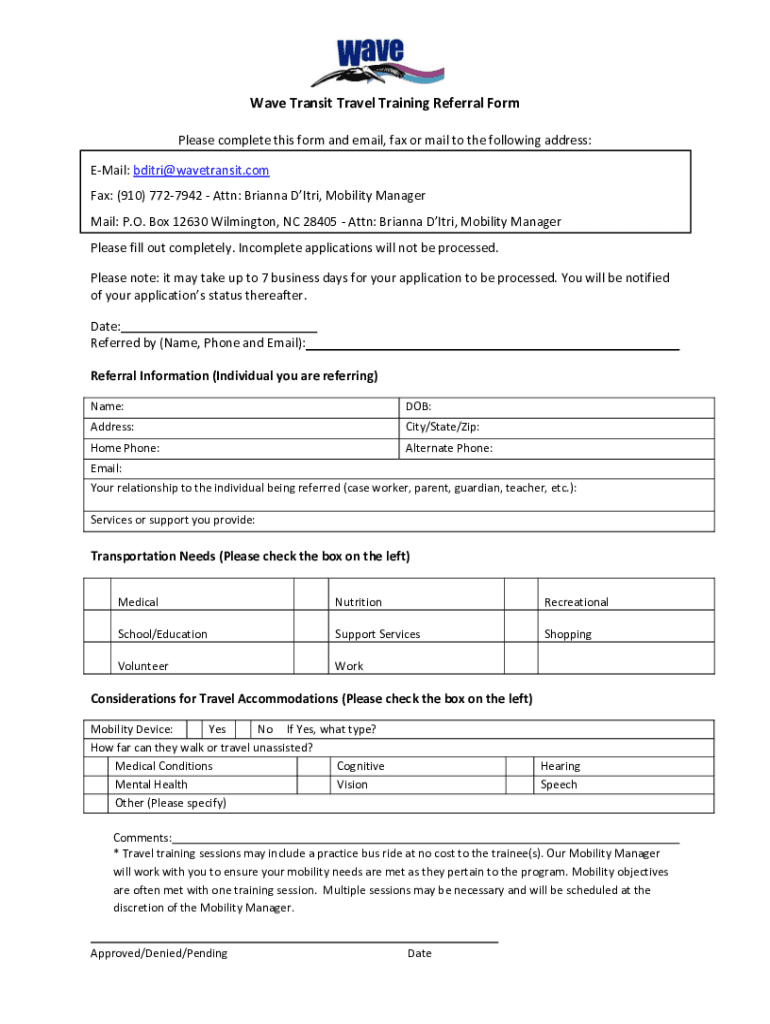 Wave Transit Travel Training Referral Form Please complete this form and email, fax or mail to the following address: Email: bditri@wavetransit.com Fax: (910) 7727942 Attn: Brianna Dmitri, Mobility