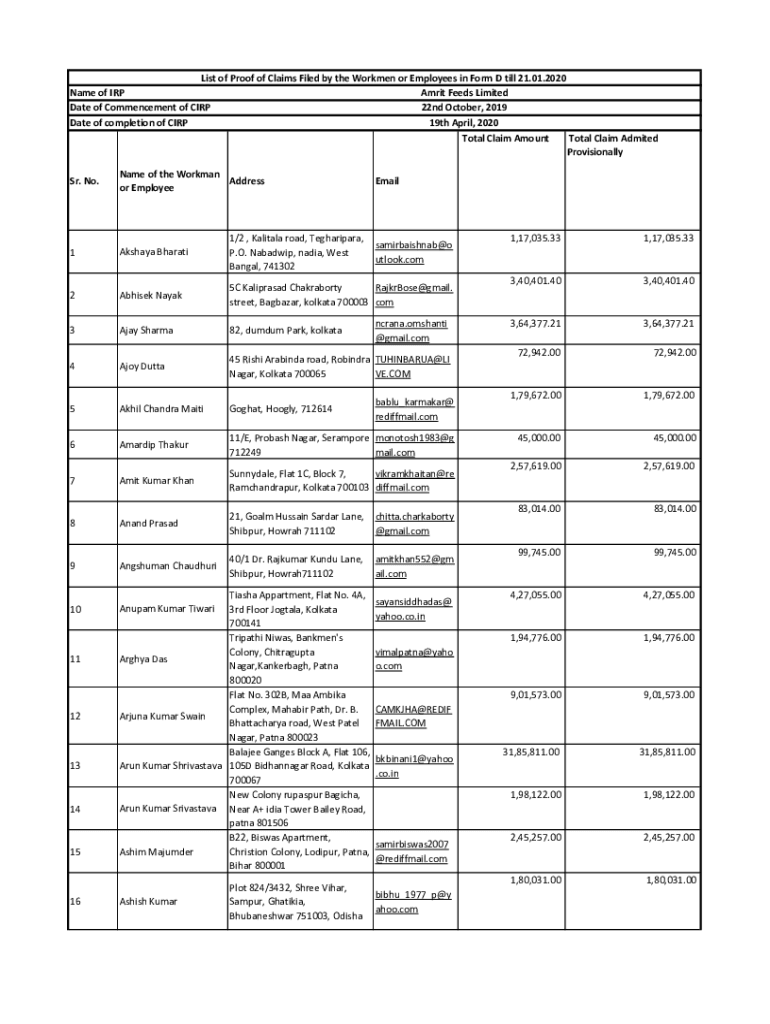 List of Proof of Claims Filed by the Workmen or Employees in Form D till 21.01.2020 Name of IRP Ambit Feeds Limited Date of Commencement of CORP 22nd October 2019 Date of completion of CORP 19th April
