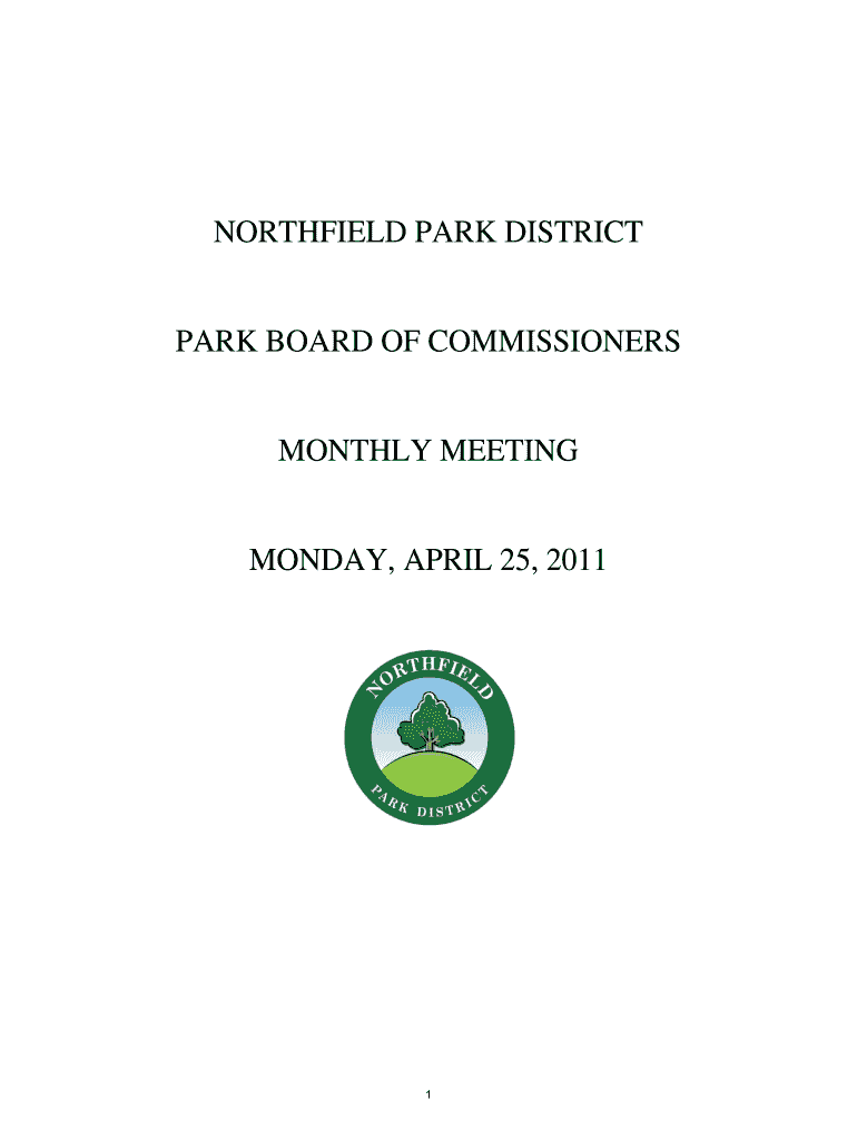 NORTHFIELD PARK DISTRICT PARK BOARD OF COMMISSIONERS MONTHLY MEETING MONDAY, APRIL 25, 2011 1 NORTHFIELD PARK DISTRICT REGULAR BOARD MEETING MONDAY, APRIL 25, 2011, NORTHFIELD COMMUNITY CENTER Boardroom