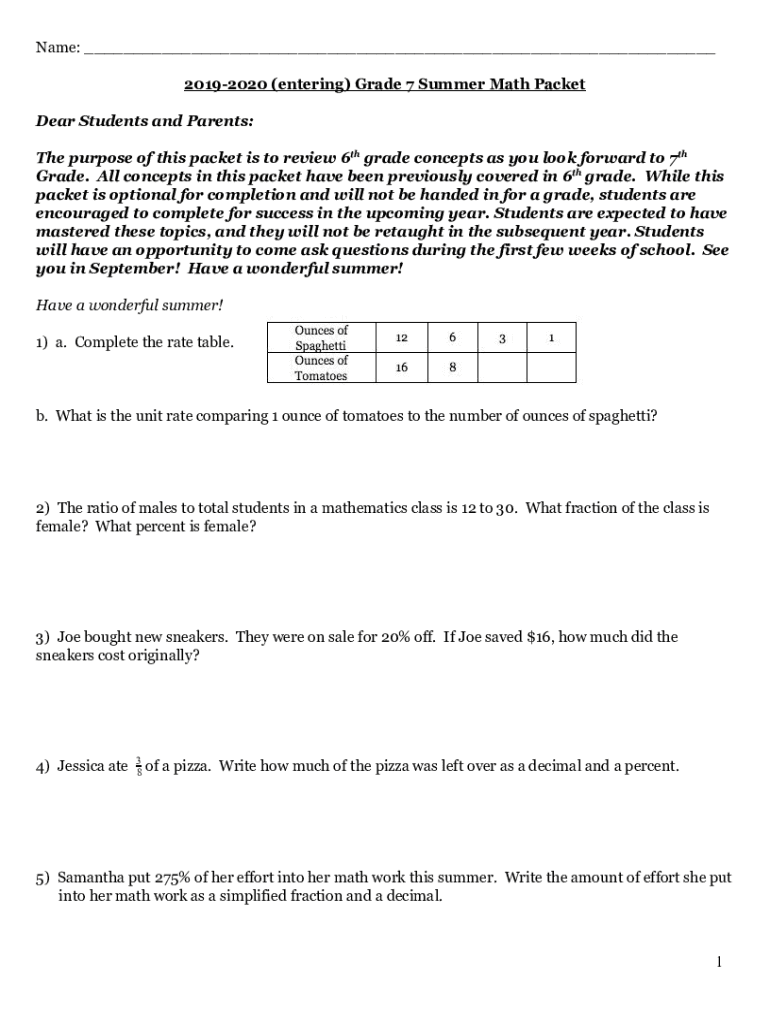 Name: ___ 20192020 (entering) Grade 7 Summer Math Packet Dear Students and Parents: The purpose of this packet is to review 6th grade concepts as you look forward to 7th TH Grade. All concepts in