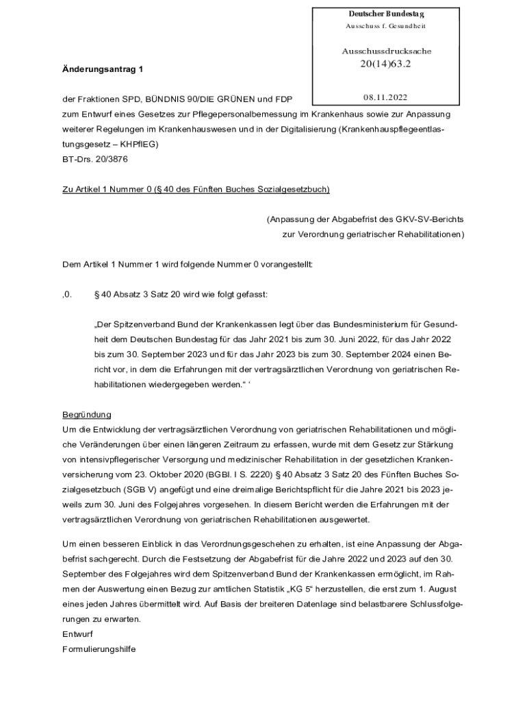 Schuss f. GesundheitAusschussdrucksache20(14)63.2nderungsantrag 1der Fraction SPD, BLINIS 90/DIE GREEN UND FDP08.11.2022zum Century lines Reserves our Pflegepersonalbemessung I'm