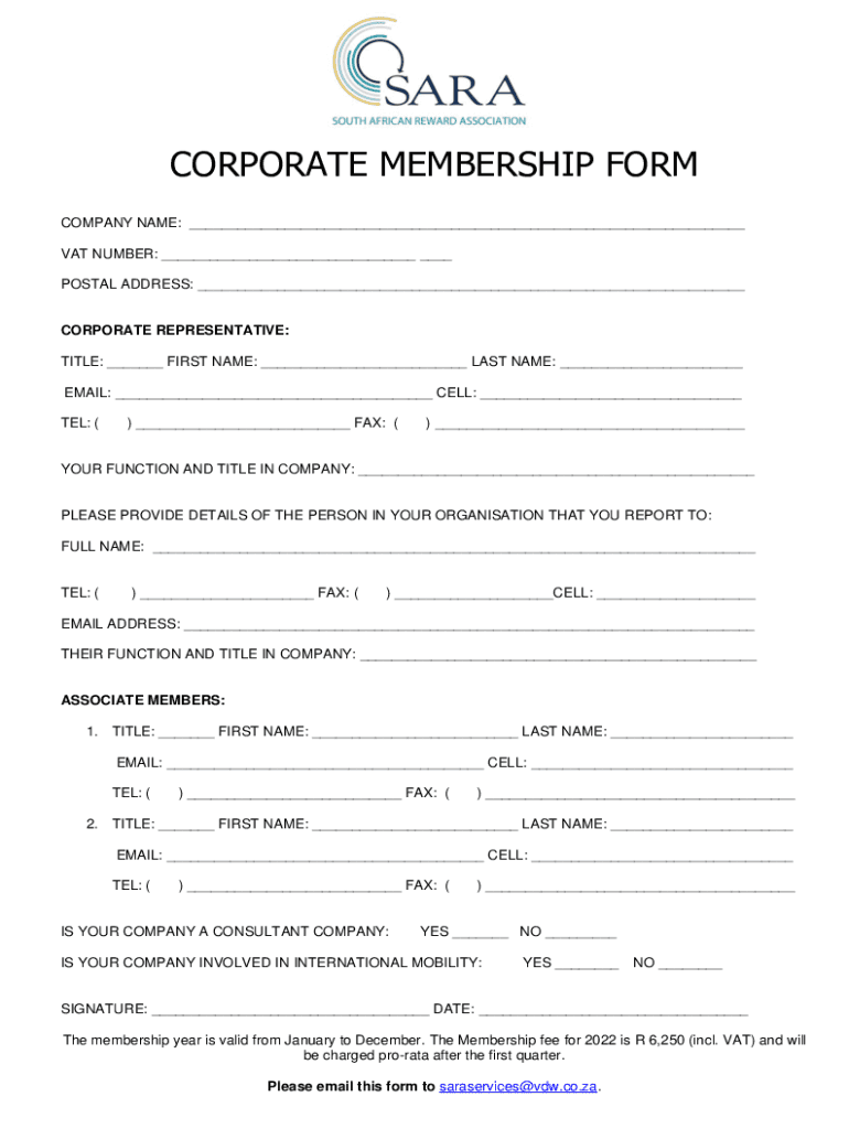 CORPORATE MEMBERSHIP FORM COMPANY NAME: ___ VAT NUMBER: ___ ___ POSTAL ADDRESS: ___CORPORATE REPRESENTATIVE: TITLE: ___ FIRST NAME: ___ LAST NAME: ___ EMAIL: ___ CELL: ___ TEL: () ___ FAX: () ___YOUR