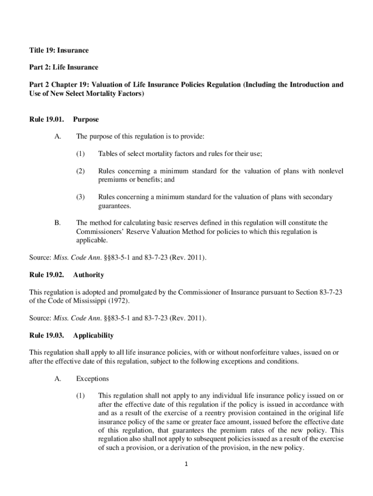 Title 19: Insurance Part 2: Life Insurance Part 2 Chapter 19: Valuation of Life Insurance Policies Regulation (Including the Introduction and Use of New Select Mortality Factors)Rule 19.01. A.B. Purpose
