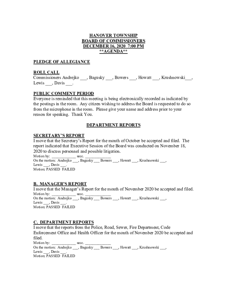 HANOVER TOWNSHIP BOARD OF COMMISSIONERS DECEMBER 16, 2020 7:00 PM **AGENDA** PLEDGE OF ALLEGIANCE ROLL CALL Commissioners Andrew ___, Busy ___, Bowers ___, Ho watt ___, Krushnowski___, Lewis ___,