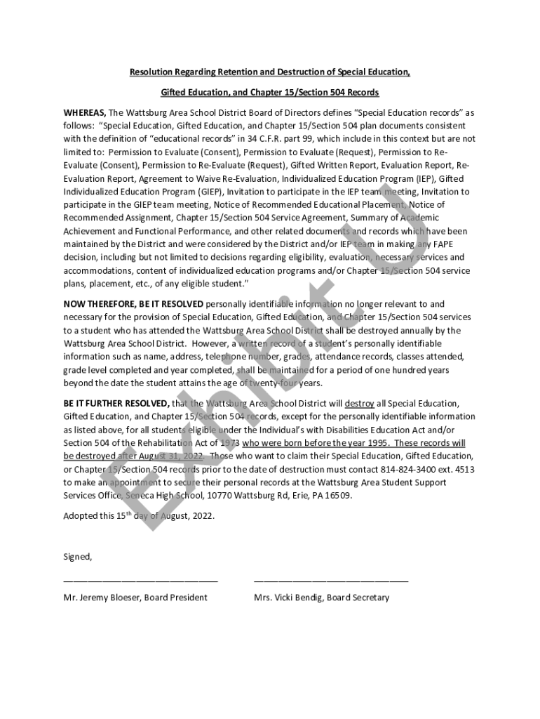 Resolution Regarding Retention and Destruction of Special Education, Gifted Education, and Chapter 15/Section 504 RecordsUWHEREAS, The Watts burg Area School District Board of Directors defines Special