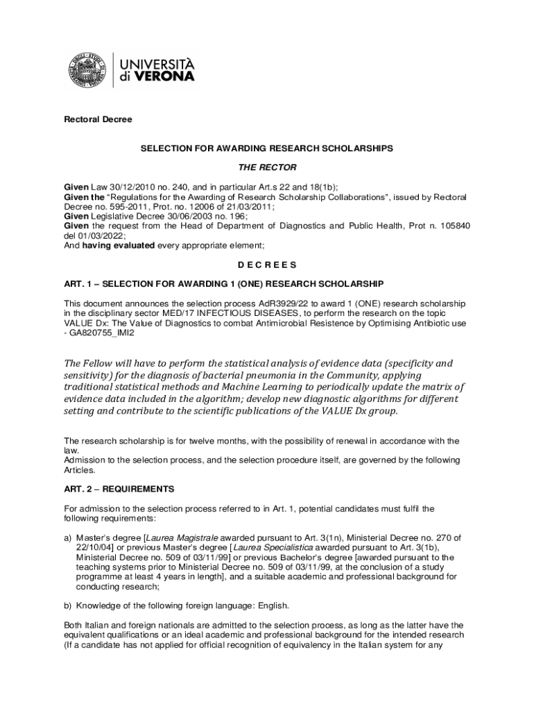 Pectoral DecreeSELECTION FOR AWARDING RESEARCH SCHOLARSHIPS THE RECTOR Given Law 30/12/2010 no. 240, and in particular Art’s 22 and 18(1b); Given the Regulations for the Awarding of Research Scholarship