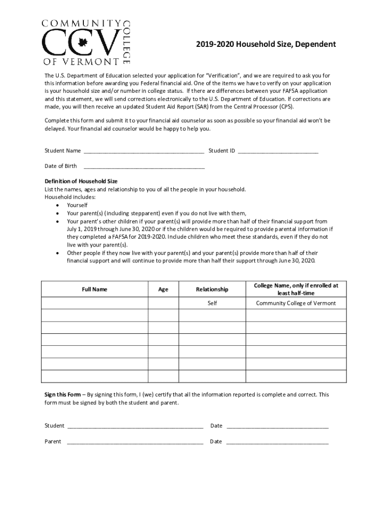 20192020 Household Size, Dependent The U.S. Department of Education selected your application for Verification, and we are required to ask you for this information before awarding you Federal financial