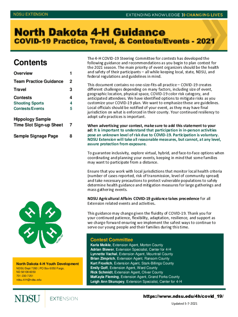 DSU EXTENSION North Dakota 4H GuidanceCOVID19 Practice, Travel, & Contests/Events 2021Contents Overview1Team Practice Guidance2Travel3Contests4Shooting Sports Contests/Events4 5Hippology Sample Time