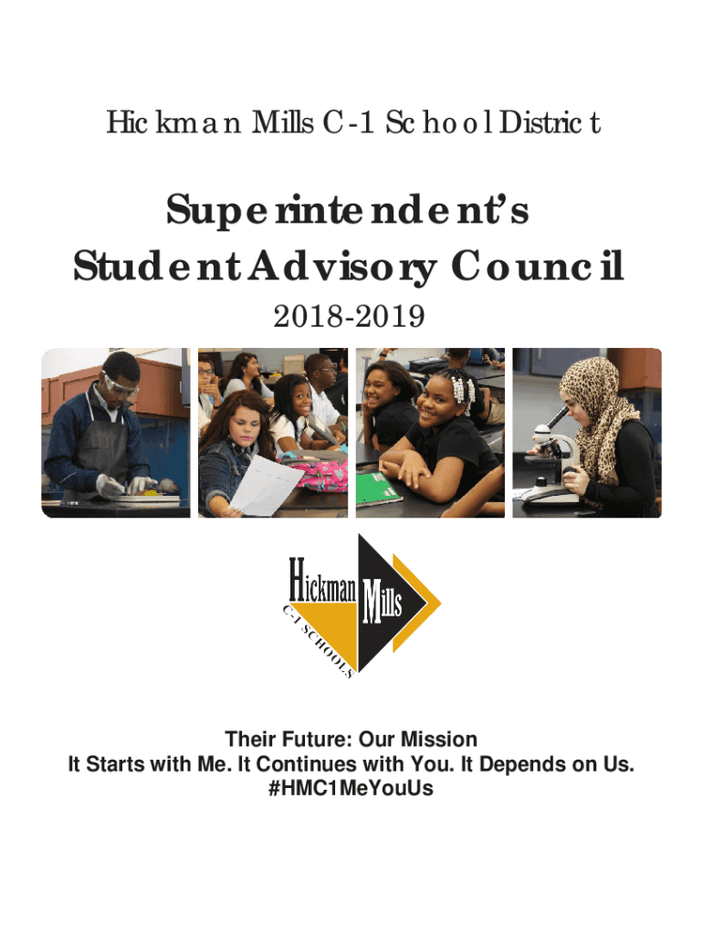 Hickman Mills C1 School DistrictSuperintendents Student Advisory Council 20182019Their Future: Our Mission It Starts with Me. It Continues with You. It Depends on Us. #HMC1MeYouUsHickman Mills C1