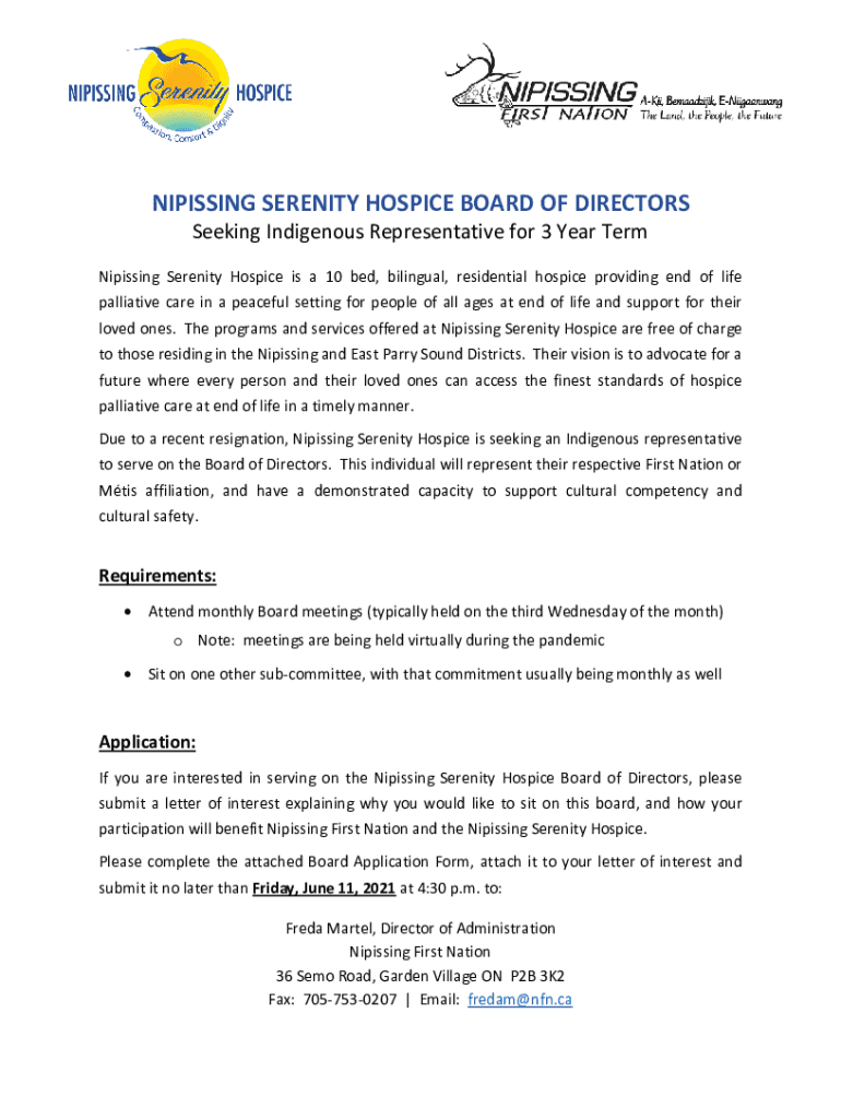 PISSING SERENITY HOSPICE BOARD OF DIRECTORS Seeking Indigenous Representative for 3 Year TermNipissing Serenity Hospice is a 10 bed, bilingual, residential hospice providing end of life palliative