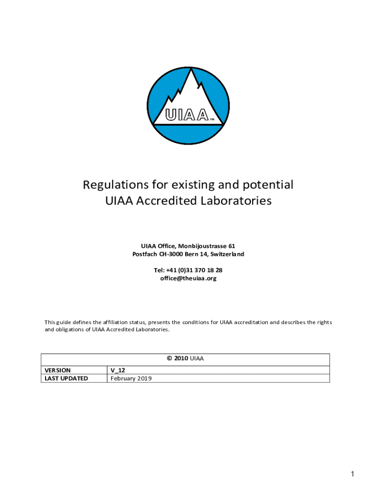 Regulations for existing and potential IAA Accredited LaboratoriesUIAA Office, Monbijoustrasse 61 Postal CH3000 Bern 14, Switzerland Tel: +41 (0)31 370 18 28 office@theuiaa.orgThis guide defines the